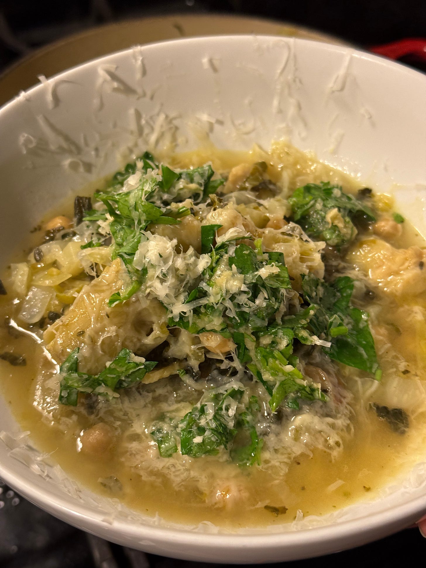 To serve, ladle into a bowl, top with a lot of freshly grated parmesan, and some of the salted parsley mix.